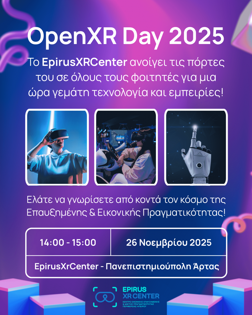 20 November, 2025 Anouncement,Event EPIRUS XR CENTER – OPEN XR Share EPIRUS XR CENTER – OPEN XR DAY November 26, 2025 | 2:00 p.m. – 3:00 p.m. | University Campus of Arta The Epirus XR Center opens its doors and invites all students a special Open Day event dedicated to Augmented, Virtual, and Mixed Reality […]