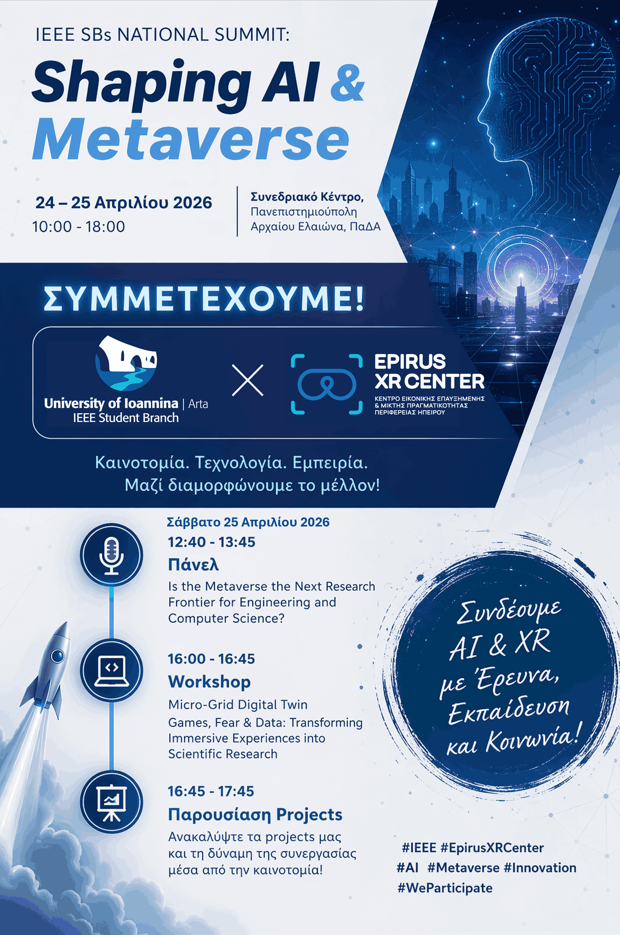 21 April, 2026 Anouncement,Event Strong Presence of the IEEE SB UOI Arta and the EpirusXRCenter at the IEEE SBs National Summit: Shaping AI & Metaverse Share Strong Presence of the IEEE SB UOI Arta and the EpirusXRCenter at the IEEE SBs National Summit: Shaping AI & Metaverse The IEEE Student Branch of the University of […]